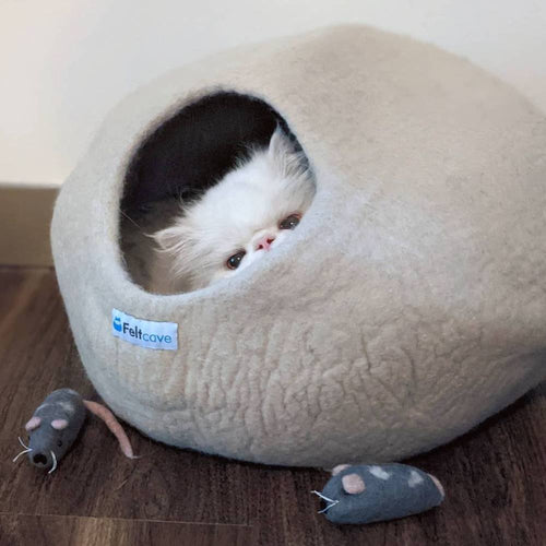 Our cats range in age from kittens to senior and they all absolutely love the FELTCAVE! They took to it immediately. It offers them a secure feeling and a good spot to hide or nap. It is made SO well and seems to be very durable. The felt mice they make are also a huge hit and are made extremely well too. They aren’t flimsy or getting lost right away like standard, smaller mouse toys. Great products! Definitely recommend and plan to give as gifts as well!